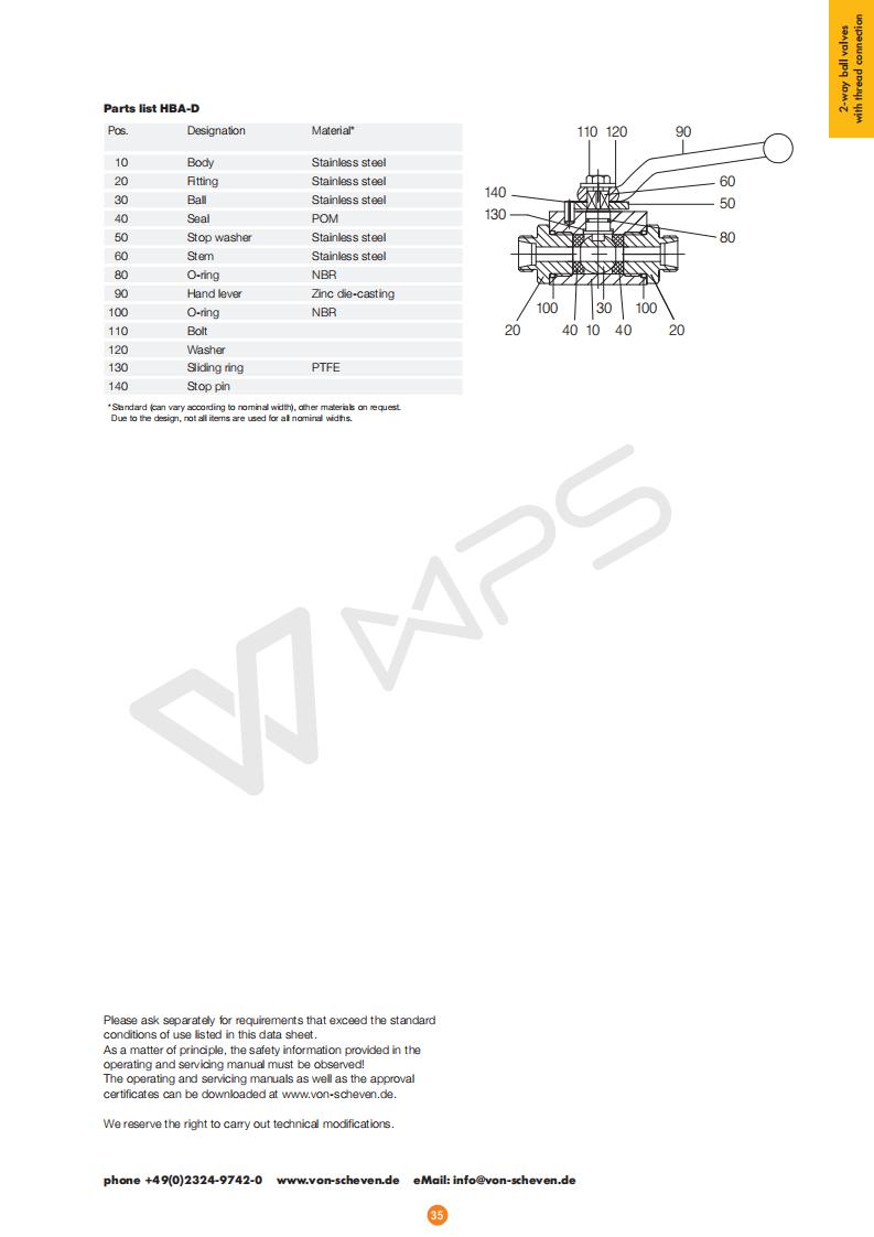 德國(guó)von scheven是歐洲著名的球閥制造商,是一家有80多年歷史的家族企業(yè)。德國(guó)von scheven的產(chǎn)品取得德國(guó)TUV認(rèn)證、ISO9001認(rèn)證、AD-2000認(rèn)證、DGRL97/23/EG、TA-Luft認(rèn)證、TEPD認(rèn)證、GWI認(rèn)證、VDS認(rèn)證、DVGW認(rèn)證、SVGW認(rèn)證、俄羅斯EAC認(rèn)證 技術(shù)說(shuō)明:NBA-D型球閥由兩側(cè)螺紋連接的閥體組成。主軸防吹出設(shè)計(jì)。可以加裝執(zhí)行器連接套件。訂購(gòu)時(shí)必須指定這種改裝(額外收費(fèi))。 使用條件超出本數(shù)據(jù)表中列出的標(biāo)準(zhǔn)要求的,請(qǐng)另行咨詢; 必須始終遵守操作和維護(hù)說(shuō)明,特別是安全說(shuō)明;  |