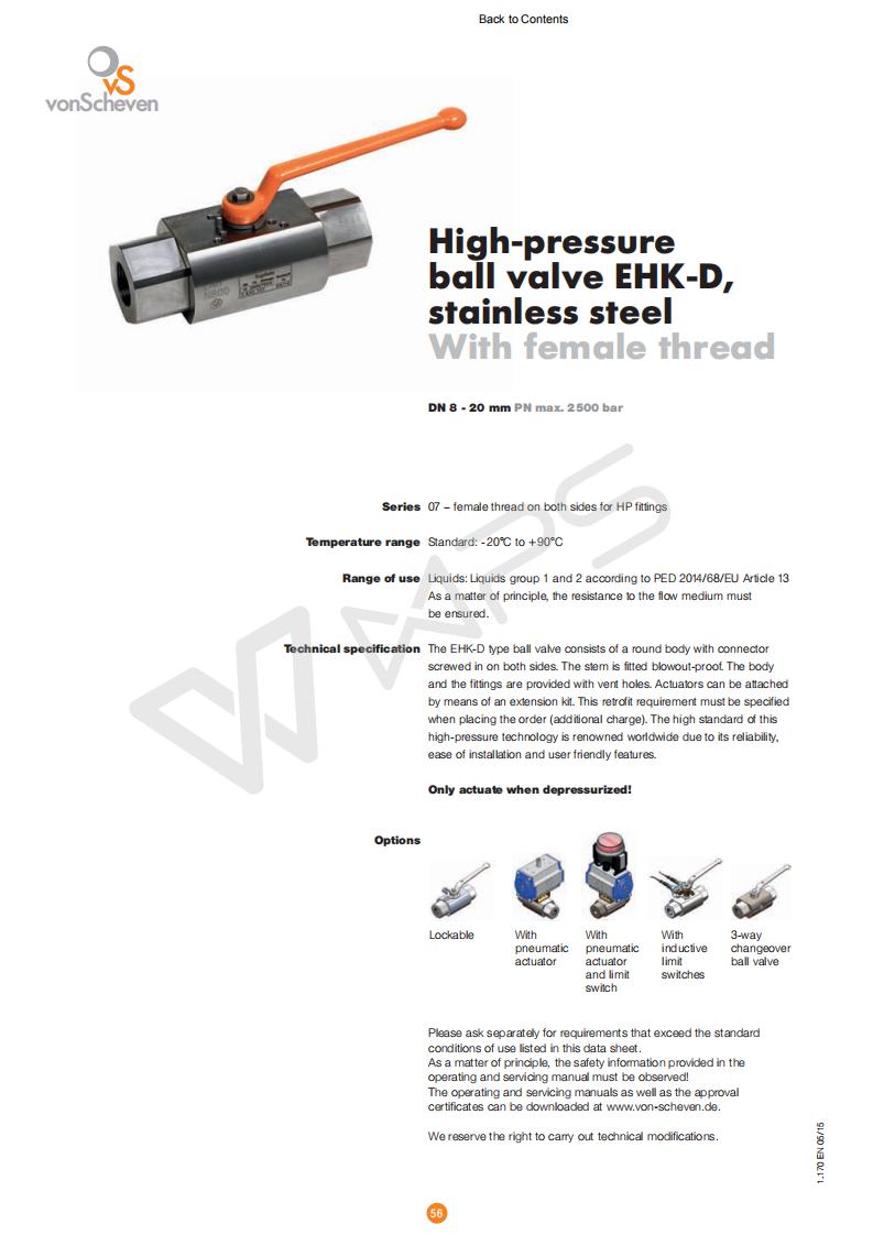 技術說明:EHK-D型球閥由一個圓形外殼和兩側擰緊的連接件組成。主軸防吹出設計。殼體和擰入件設有安全孔。可以加裝執行器連接套件,訂購時必須指定這種改裝(額外收費)。